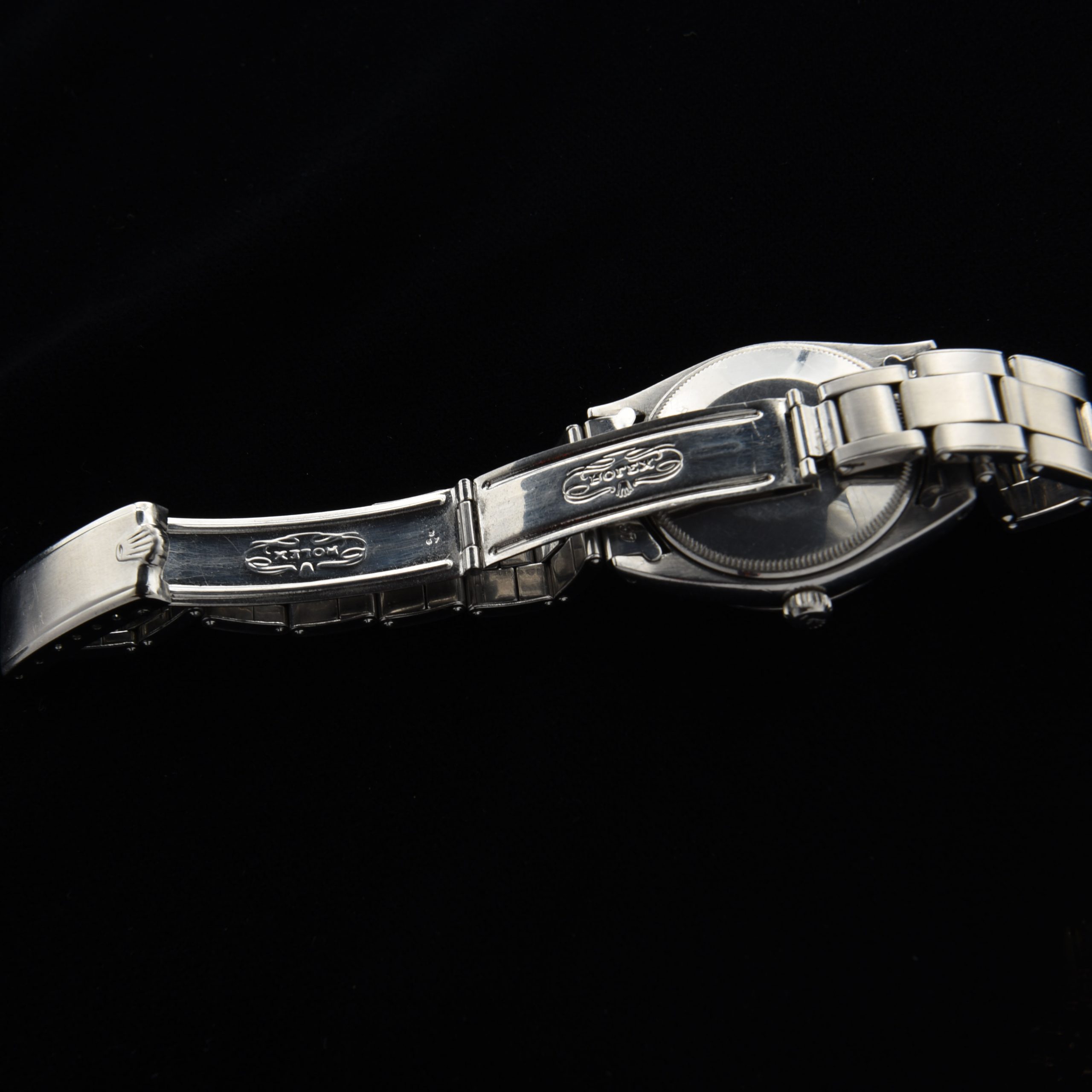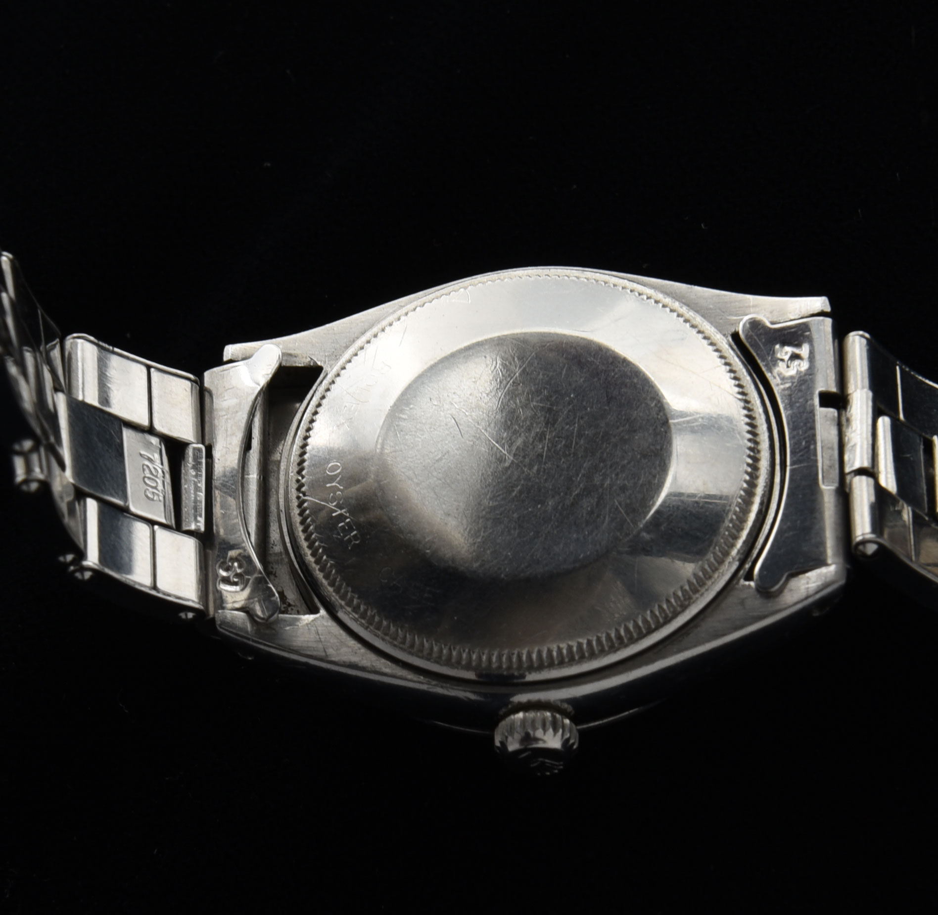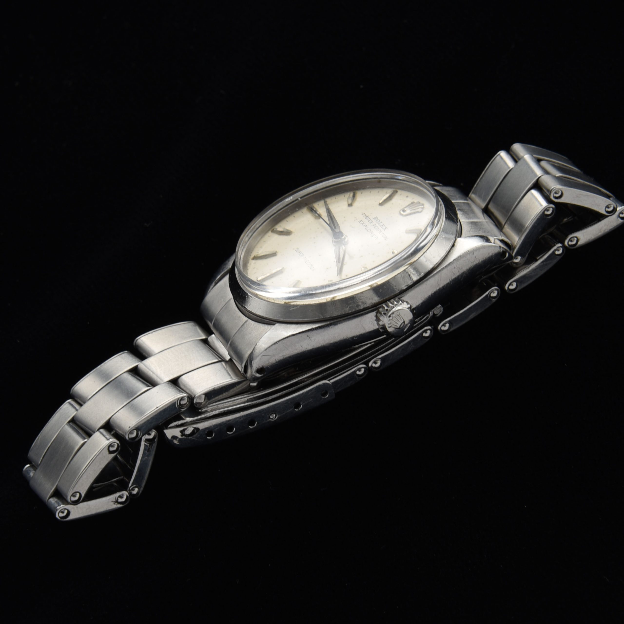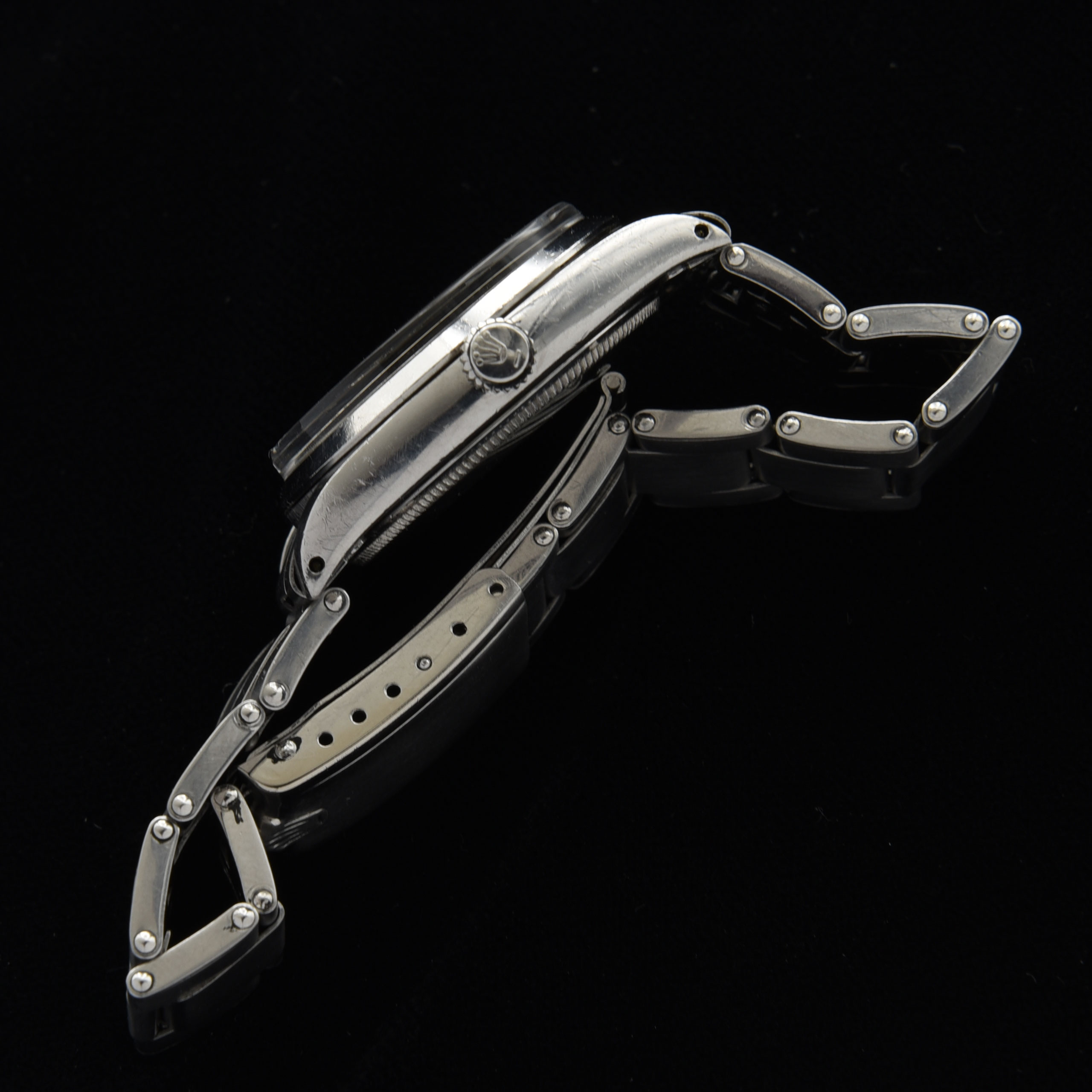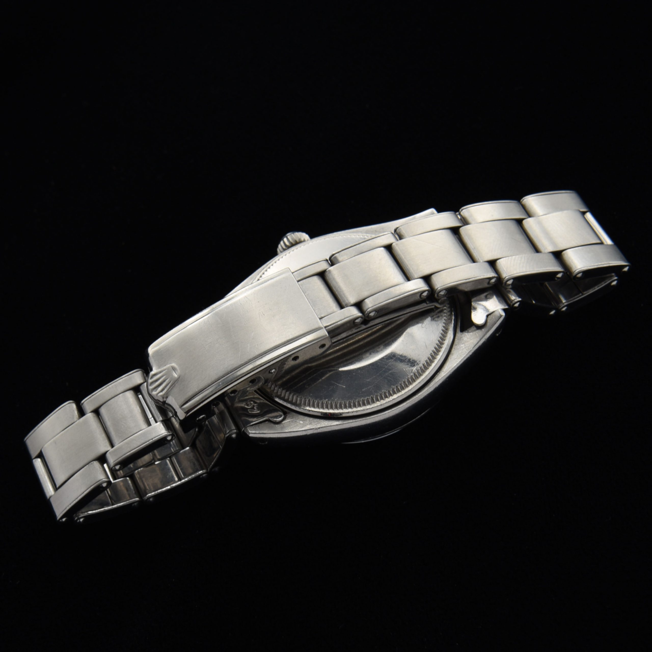 This is a very uncommon ref. 5500 1958 Rolex Explorer measuring 34mm in a stainless-steel case. These rare Explorers were made only for the Canadian market in the 1950s as an experiment in the Explorer line. The original bullseye dial makes this example very unique and hard to find. The Dauphine-style hands are original. The Canadian version Explorers also came in a gold-plated case, and another rare dress version measuring 36mm, known as the big bubbleback with reference 6298, 6098 and 6532. This ref. 1530 butterfly-automatic movement is valuable on its own, as it is also used in the Rolex Submariner. This watch comes on a period-correct Rolex Oyster, riveted ref. 7205 bracelet. We have not polished this watch to protect the original condition.