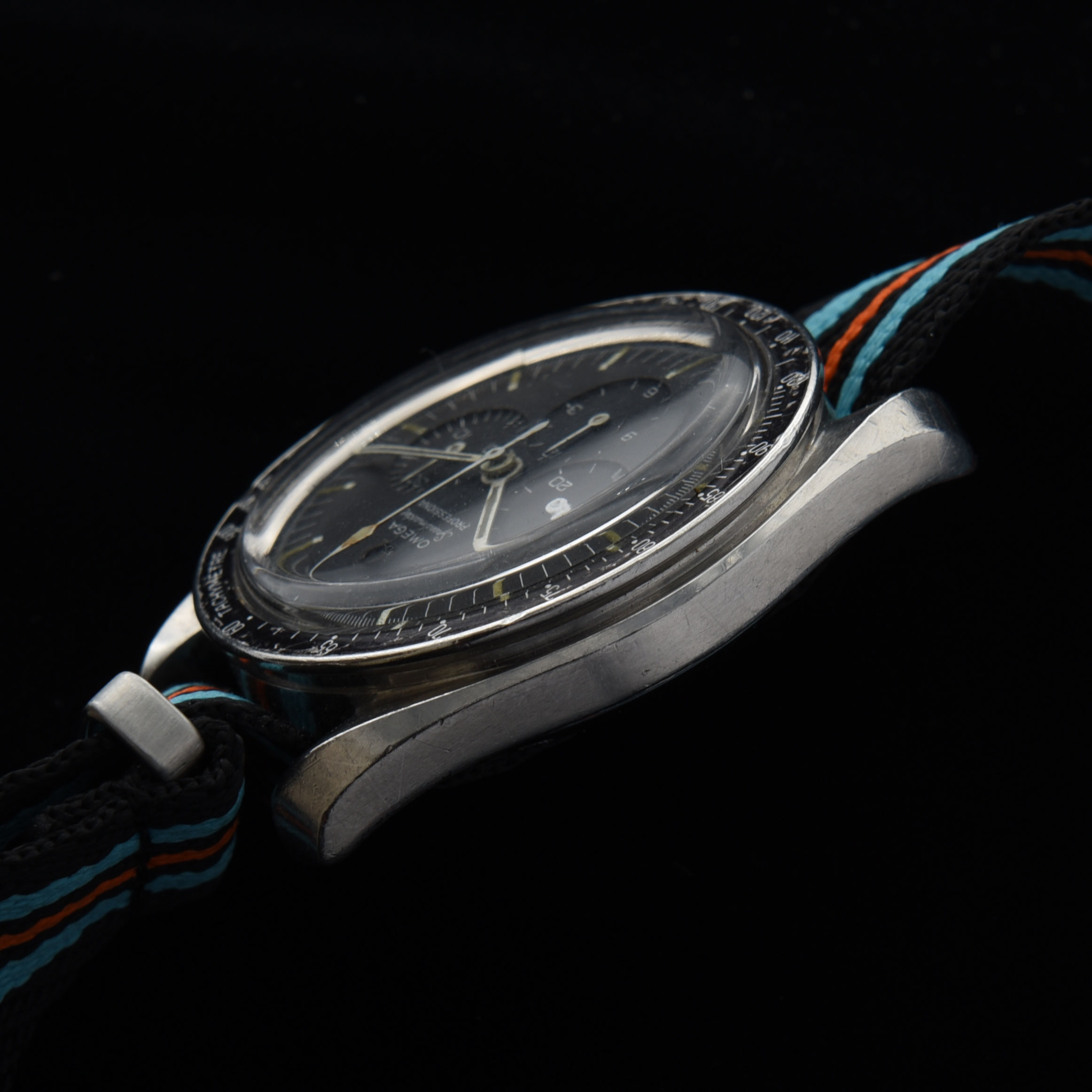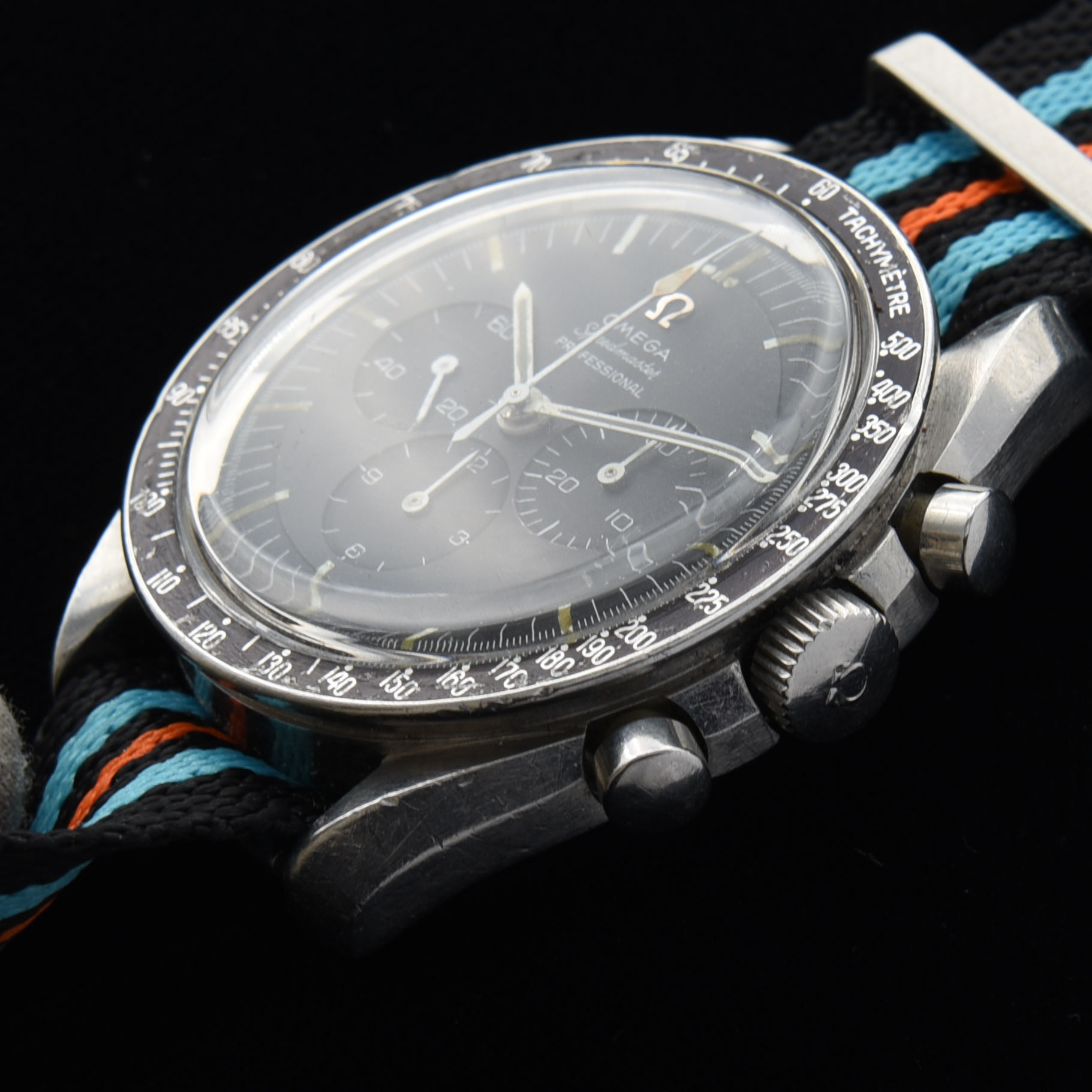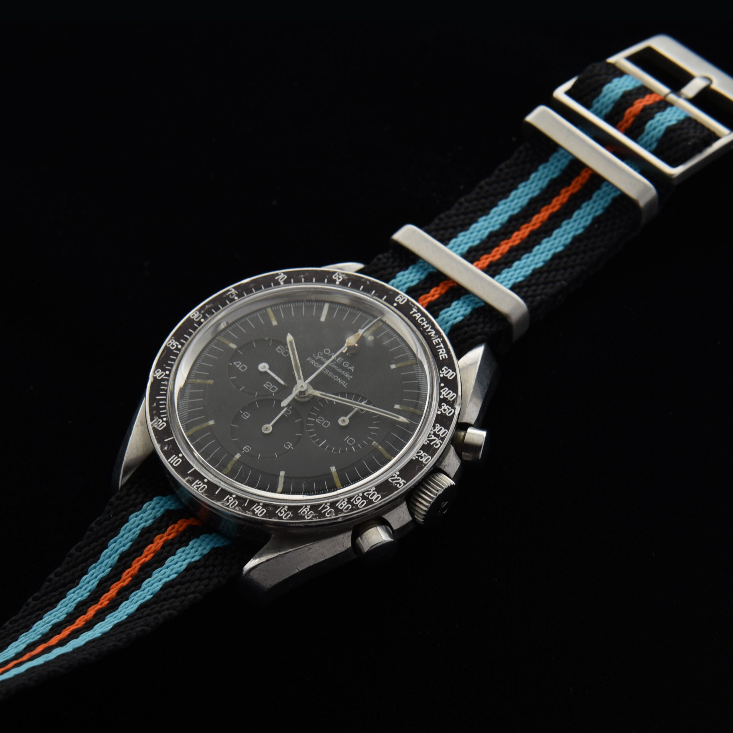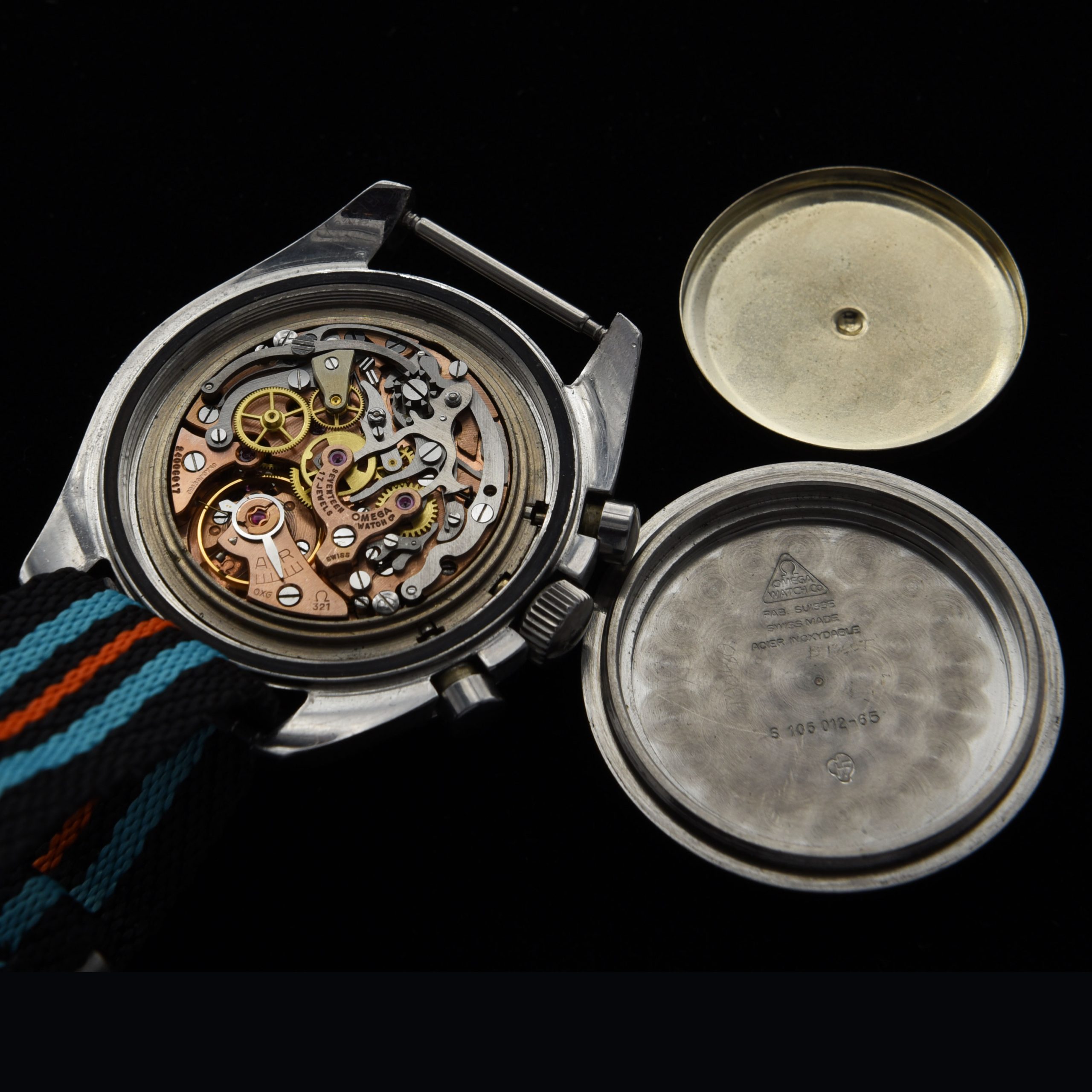 This is an honest and original example of a 1965 Omega Speedmaster ref. 105.012 chronograph measuring 42mm in steel. This watch retains the original dial, hands, hesalite crystal, case and rare dot-over-90 bezel. The caliber 321 (original) movement is working flawlessly after a recent service. The original dial looks amazing. All the lume has been kept original. The 1965 was the first model that was approved for the moon excursion.