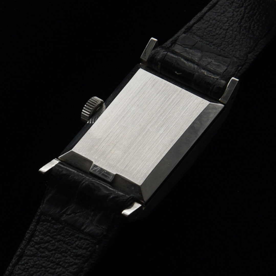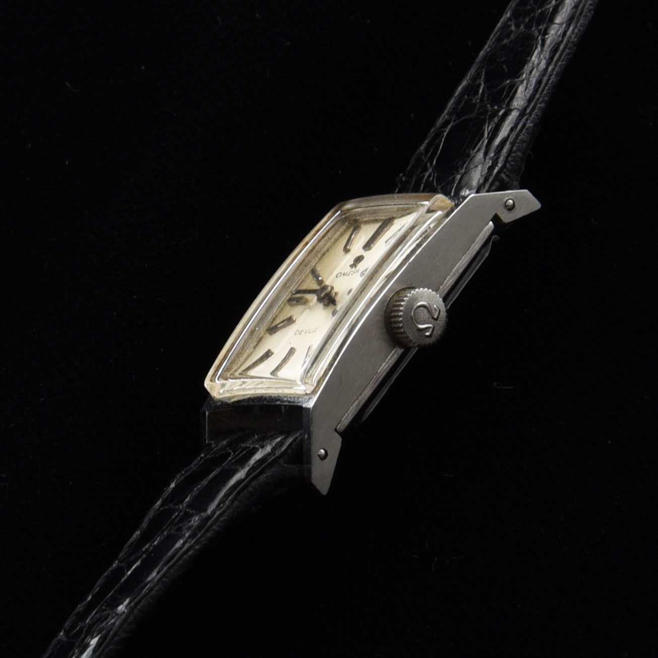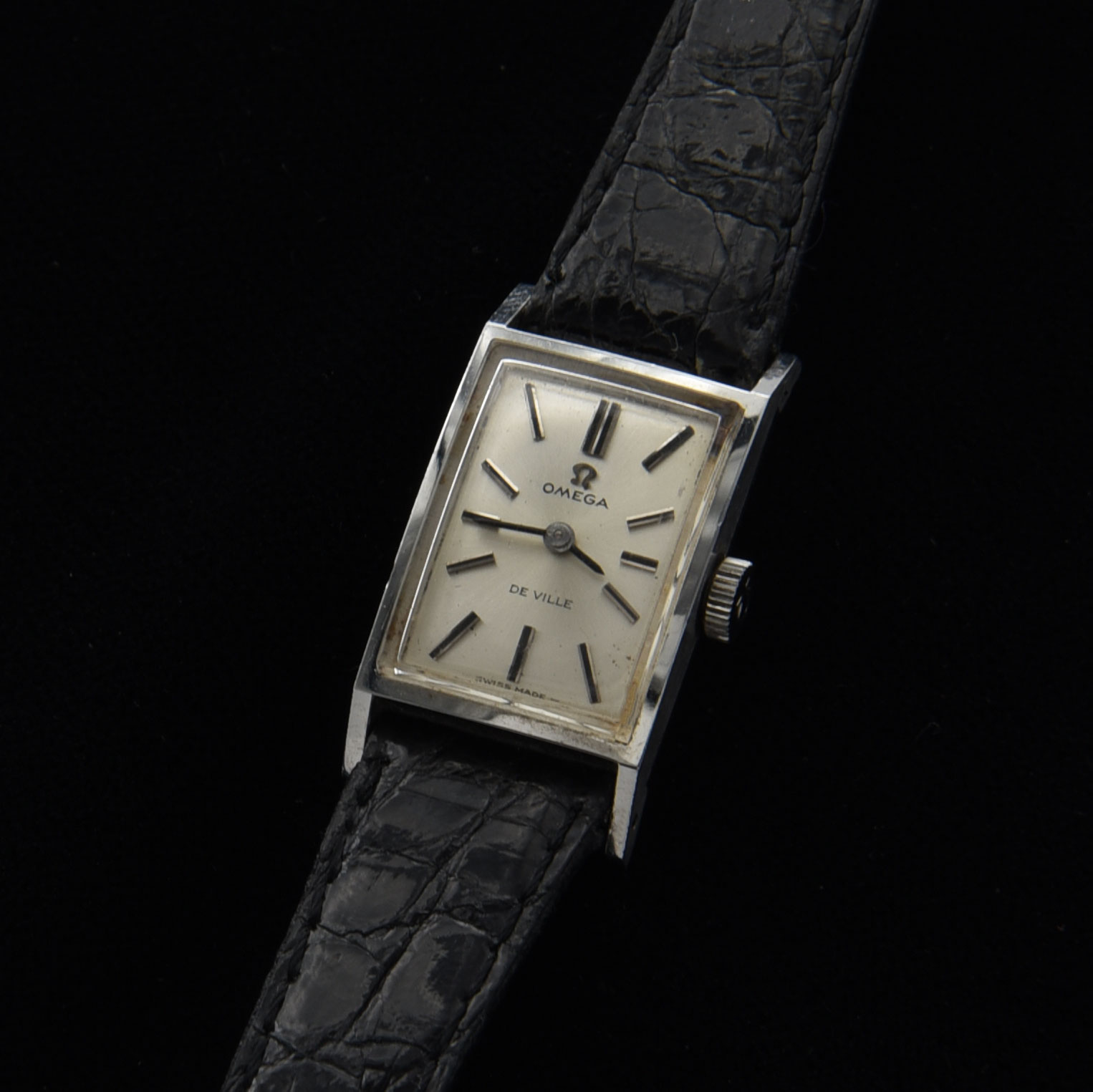 This is a vintage 1970s ladies Omega Deville manual winding watch in stainless steel measuring 15.5x28mm. The original dial having elongated-black-inset hands has some natural ageing that is barely visible while being worn. The movement is the manual caliber 485. This is a very simple and subtle ladies vintage Omega.