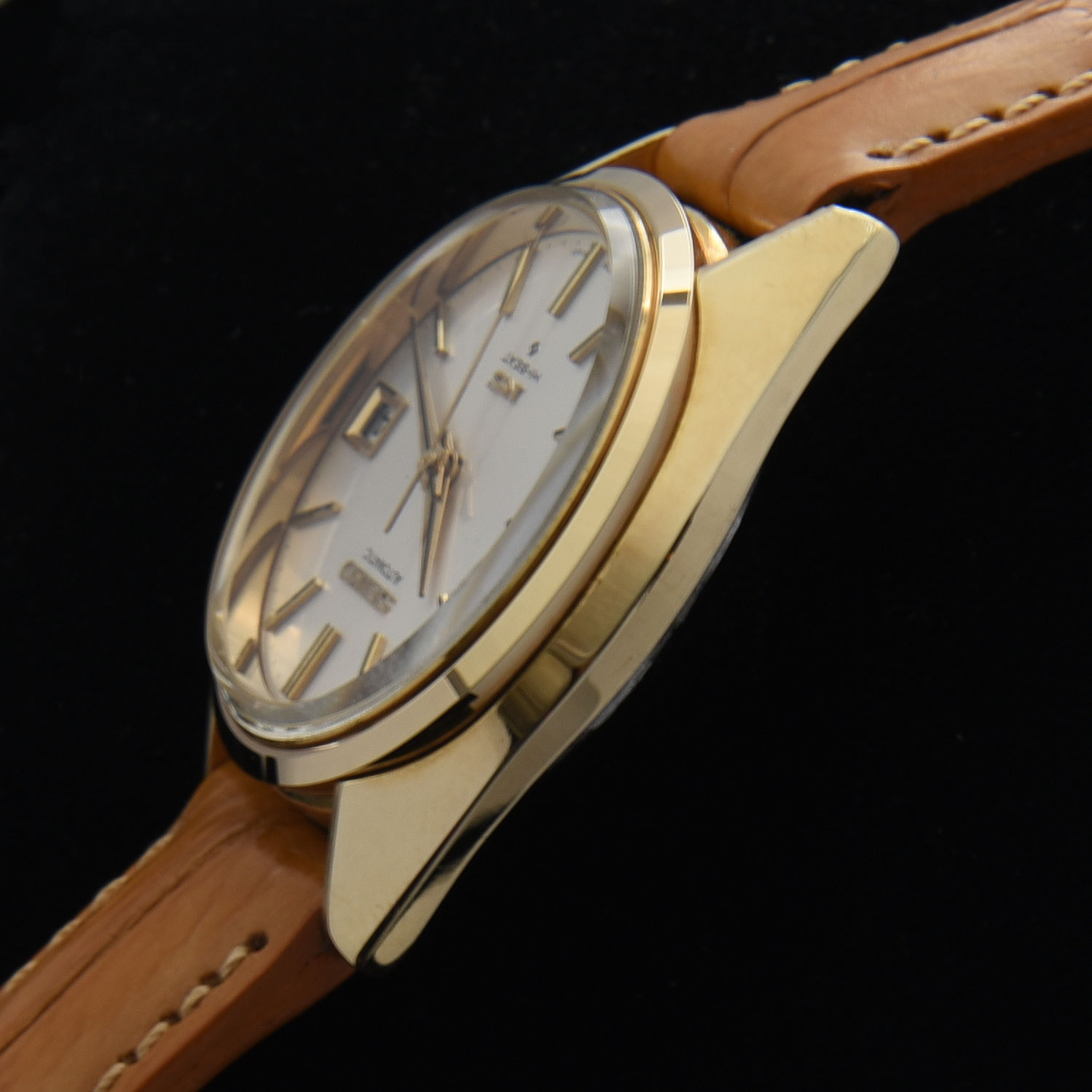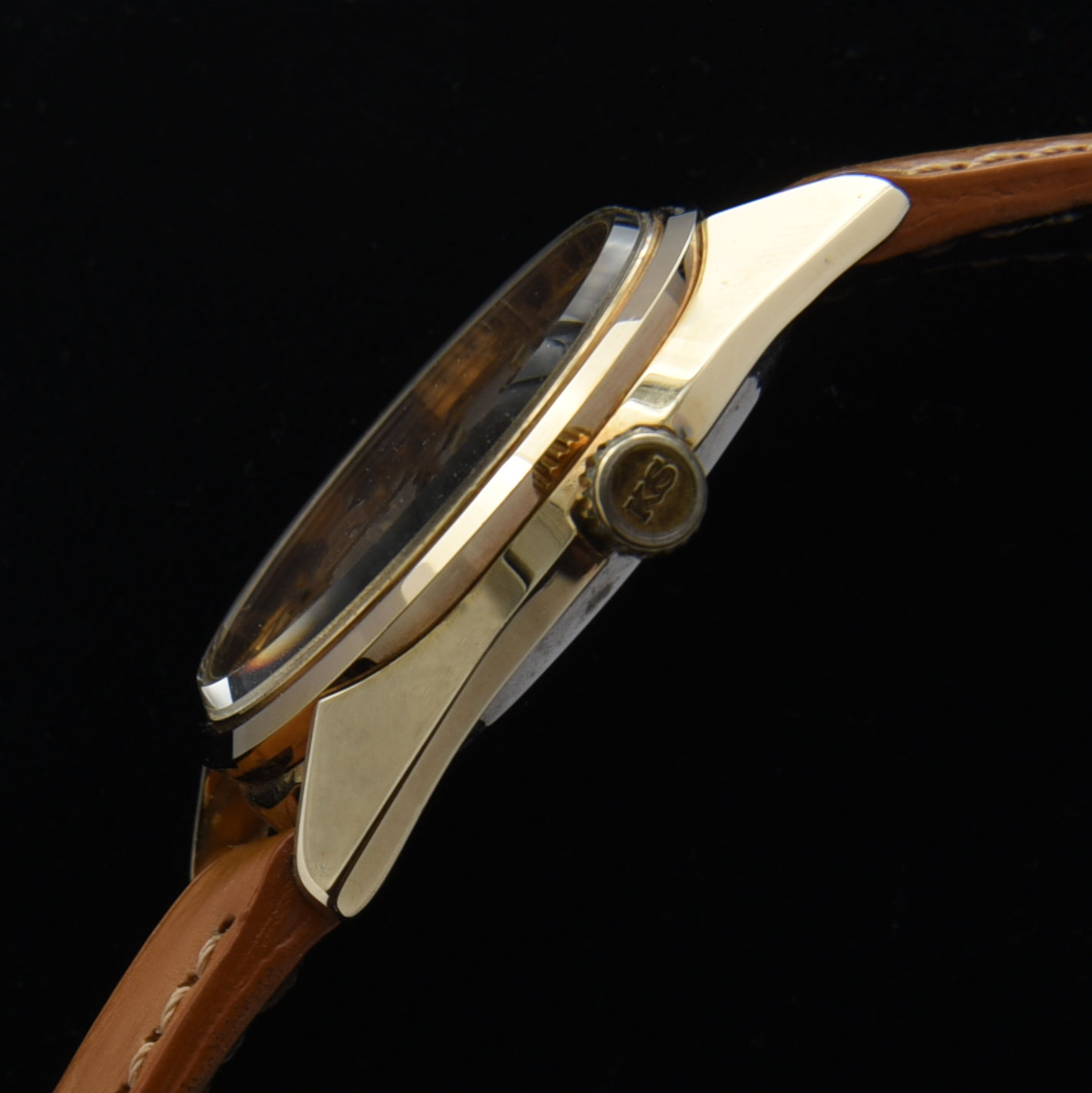 This 1971 vintage King Seiko is a prime and shimmering example housed in a ‘like-new’ 36.5mm gold-capped case with steel back. These cases have a thick layer of gold which really does not wear through over the years; hence the spectacular condition this watch exhibits. The very fine caliber 5625A automatic hi-beat movement is very accurate and was looked over by our watchmaker who said it was “sparkling”. The lustrous case back also displays the incredibly clean condition of this watch. The dial and hands are original and appear pristine. The original King Seiko winding crown is present. The band is very high quality. Gold-capped versions of the King Seiko are less common than the steel versions. This watch commands attention whilst being worn.
