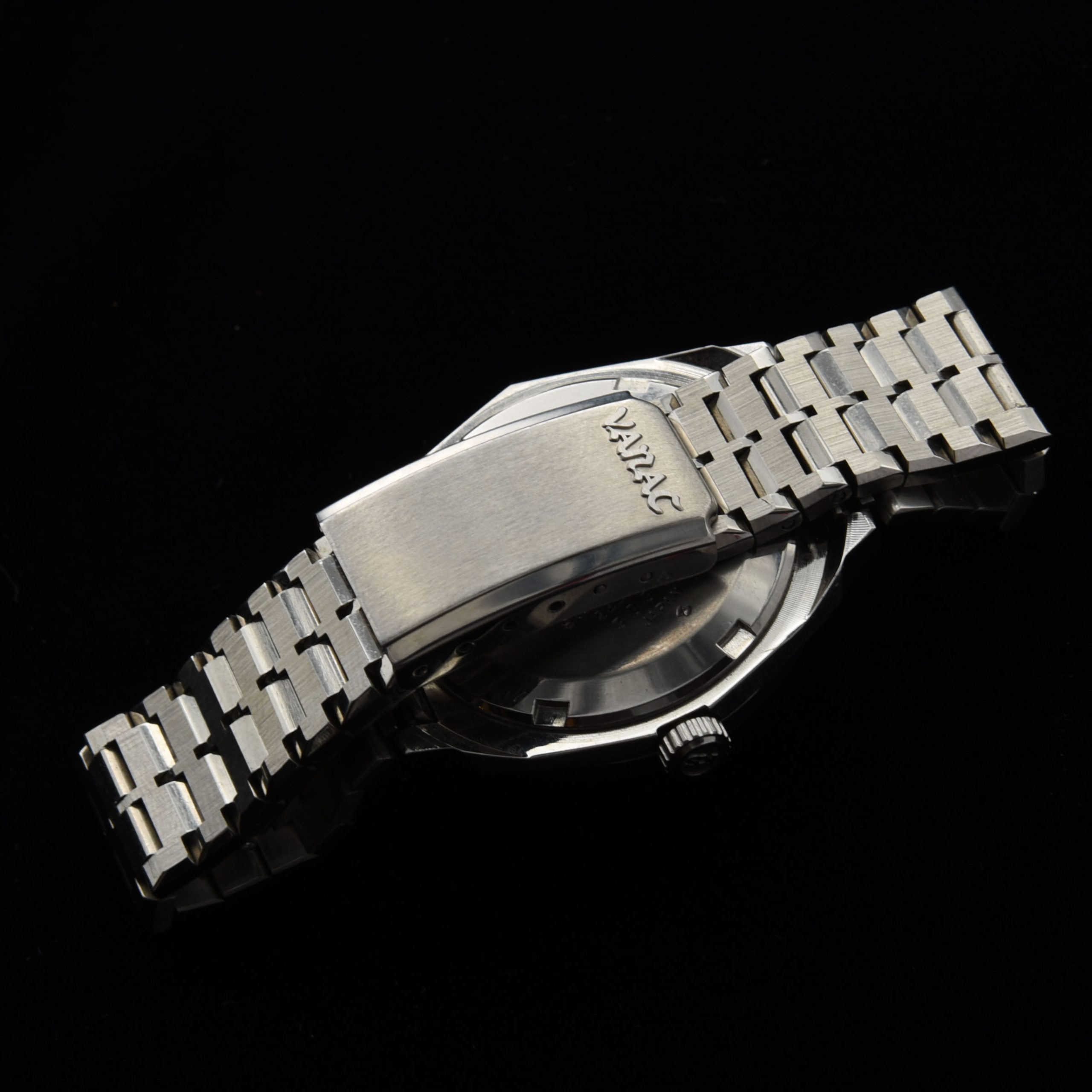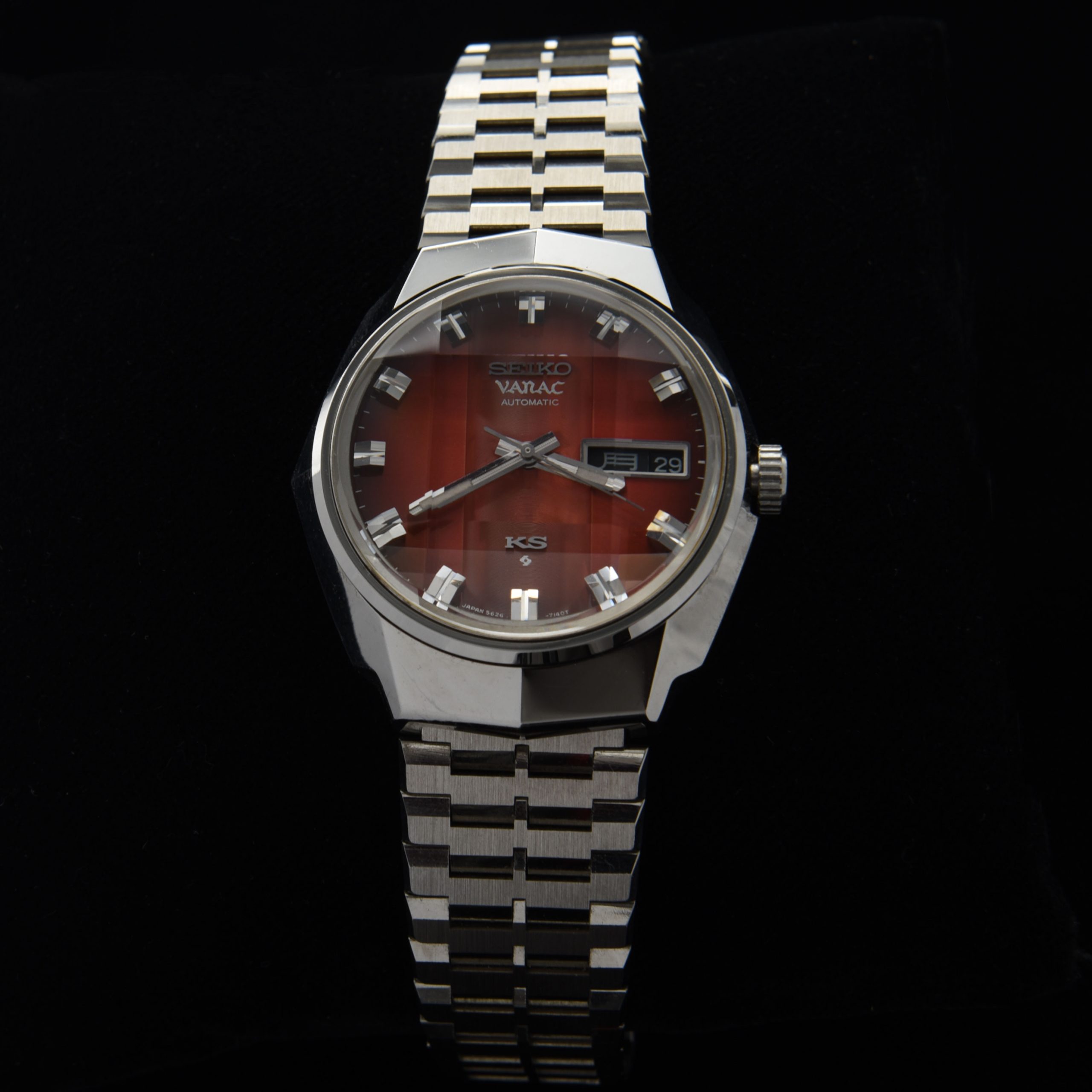 This is a very rare red dial King Seiko Vanac dating to about 1973. The red dial is extremely hard to find. This bracelet is virtually pristine. The original faceted crystal is s valuable and seldom seen; being devoid of scratches. The automatic winding King Seiko movement was serviced and is accurate. If you know your vintage King Seiko Vanacs, then you are aware; this is a highly coveted watch.