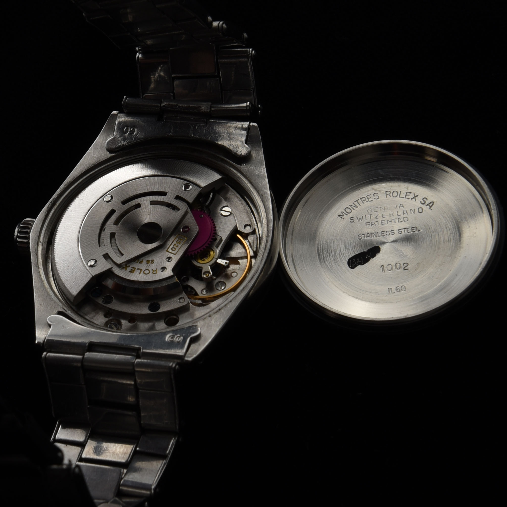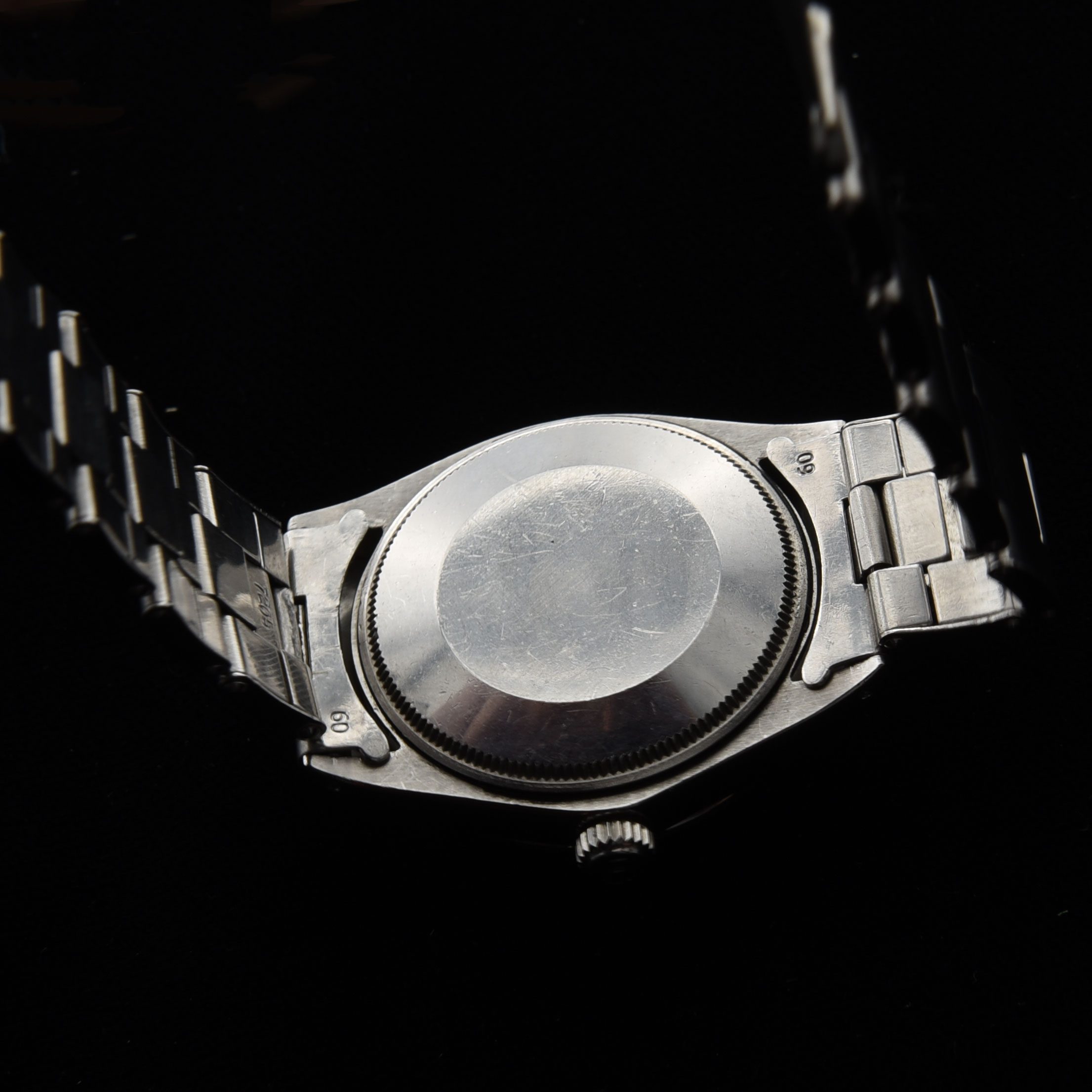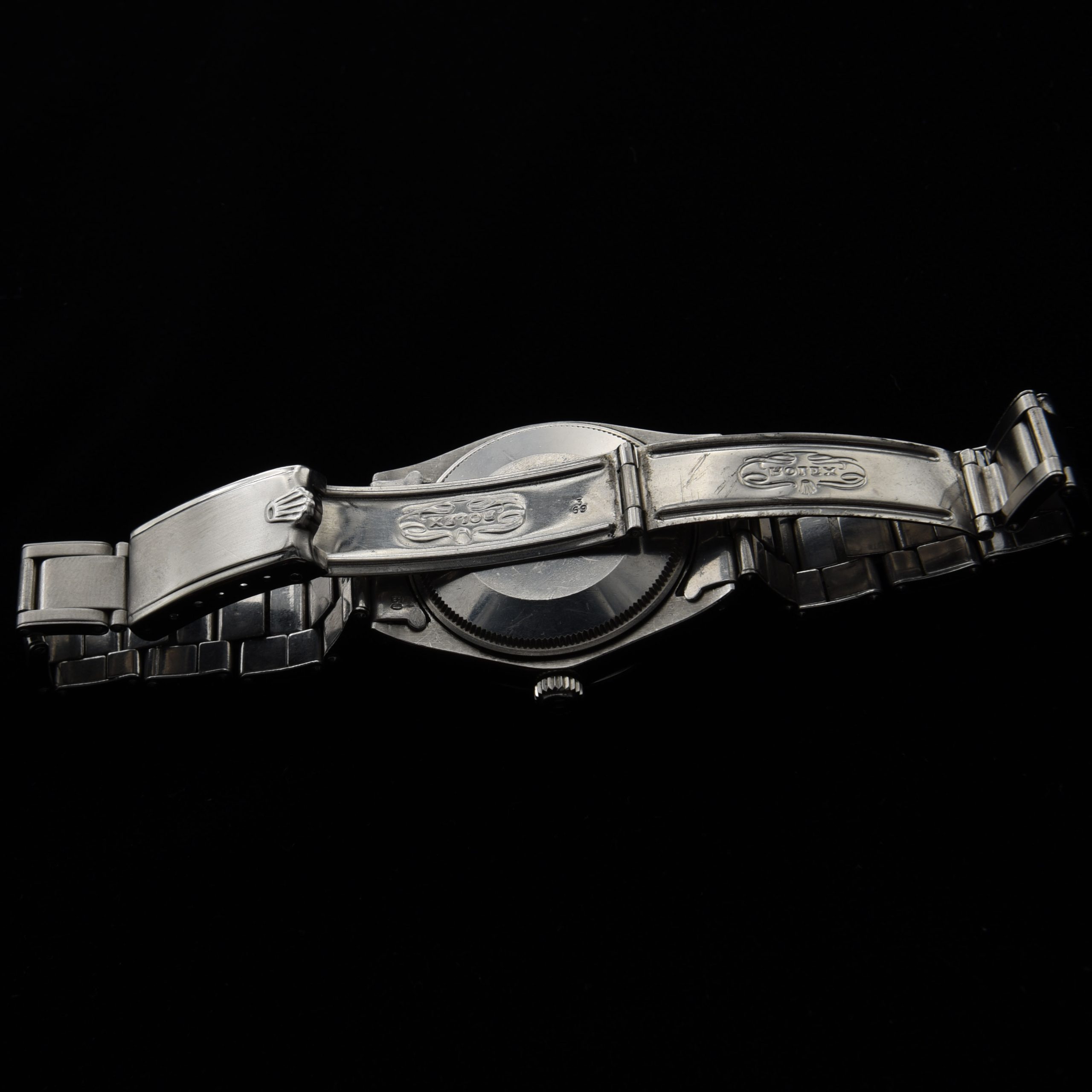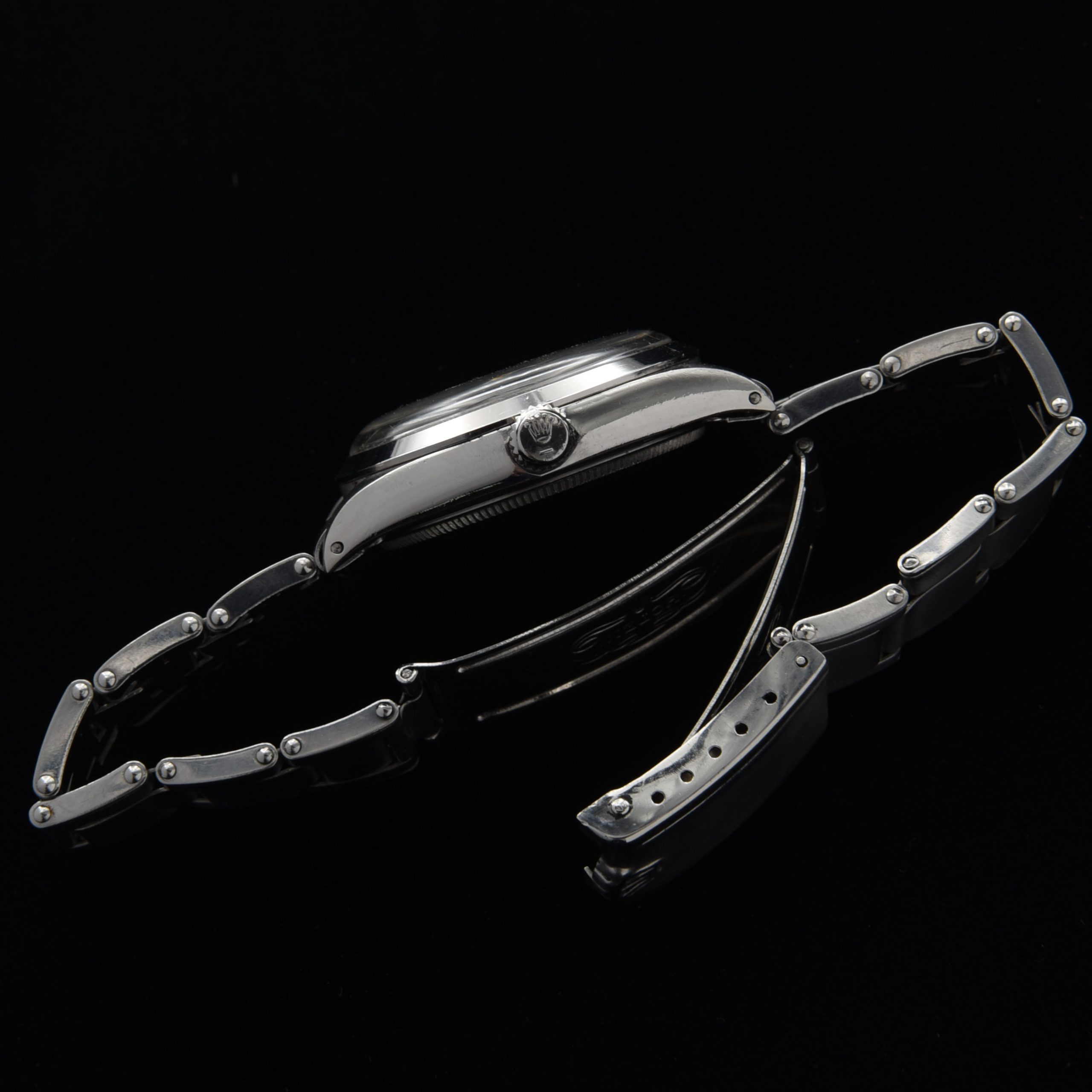 This is a preserved 34mm vintage Rolex Air-King, ref. 5500, dating to 1968. It features the reliable Rolex caliber 1520 automatic movement, which has been recently serviced and is running smoothly. The stainless-steel case retains its sharp lines and looks excellent in person, showcasing the enduring craftsmanship of this classic model. The original silver dial has developed a light, even patina, adding character without compromising legibility. While some spotting is visible in high-resolution photos, it’s much less noticeable when worn and appears far more subtle to the naked eye. This piece comes on its original 1969 Rolex riveted Oyster bracelet, which adds to its authenticity and collectability. This is a fantastic example of understated Rolex heritage—simple, timeless, and ready to wear daily or collect.